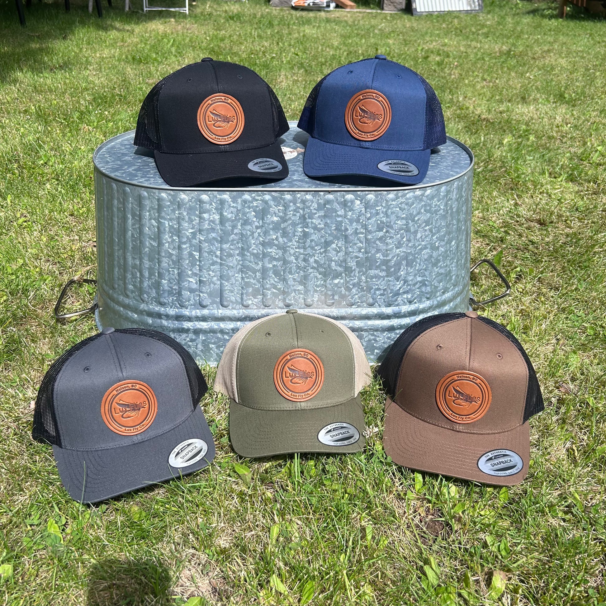 Full grain, authentic leather LuxFlies patches on Yupoong 'The Classics" style trucker Cap.